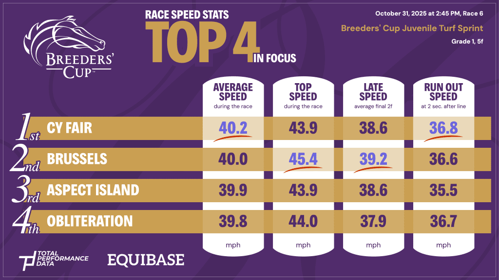 On just her 4th career start, Pacific Mission has finished 2nd in a Breeders’ Cup race and she certainly took her form to an entirely new level on Friday afternoon. Having been virtually last at the end of the first couple of furlongs, she found herself 1.47s behind the early lead. Making her way through the field under Colin Keane, she was the fastest horse in furlongs 4 (11.77s), 6 (12.30s) and 8 (11.63s) as she chased home the equally impressive Balantina. A wide draw in stall 12 may have forced Colin Keane’s hand at the start, but given the fact that she recorded the fastest run-out speed in the field at 37.89 mph, there are plenty of reasons to be excited about this filly over a mile and possibly beyond in the 2026 turf season in Europe. Her Dam (Big Break) was a G3 winner over a mile and she is a half-sister to a couple of pattern winners over 10 furlongs, so it is not impossible to think that she may yet stay even further than the mile, but she holds an entry in the Irish 1,000 Guineas at the Curragh and that would look to be an obvious target for her if she trains on over the Winter.