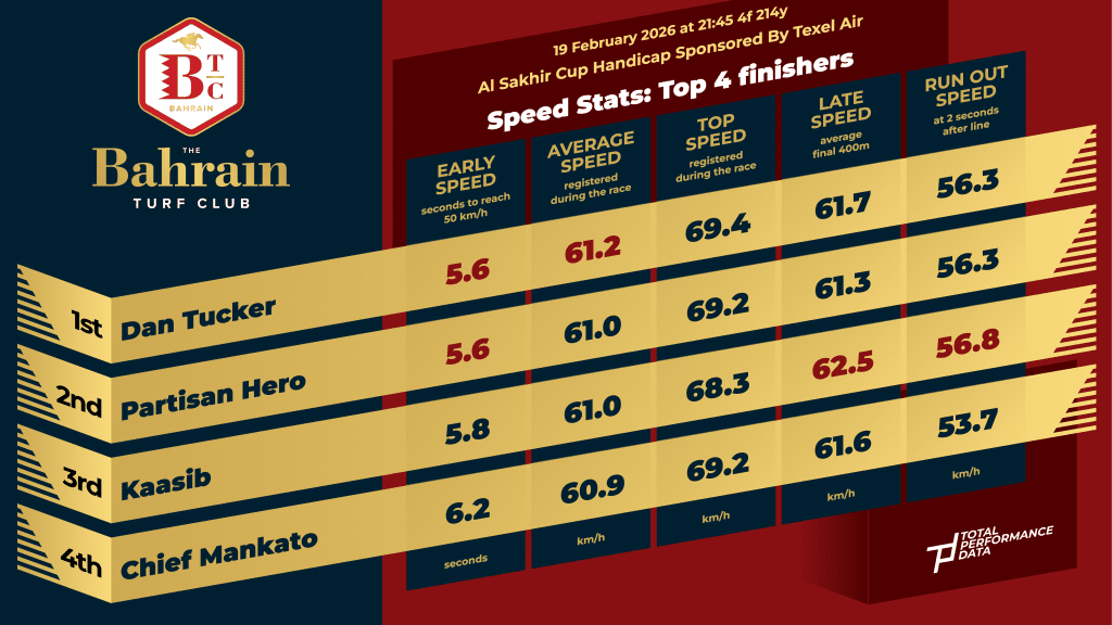 Thursday evening saw a thrilling renewal of the Al Sakhir Cup in the latest round of the Bahrain Turf Series. A field of 18 sprinters spread right across the track made for an amazing race and in the end, it was the Ali Abdulmajeed trained Dan Tucker that came out on top. A 3 time winner in the UK for Jedd O’Keeffe, he was making his first start in Bahrain on Thursday evening having been off the track since winning a handicap at York in October. That victory came from a handicap mark of just 87 and he has certainly taken his form to an entirely new level since making the switch to Bahrain. He was purchased at the horses in training sale at Tattersalls in the autumn for 170,000 guineas and has already begun to reward the investment made by Al Mohamediya Racing by taking this $48,000 contest under Neil Callan. When we get such a big field, there will always be some hard luck stories and it can be difficult to get a true handle on the form when you have so many horses in with a chance at the 2 furlong pole, but there is plenty of evidence from the data that the right horse won on the night and if he can continue to progress, Dan Tucker could develop into a serious force in the sprinting division.