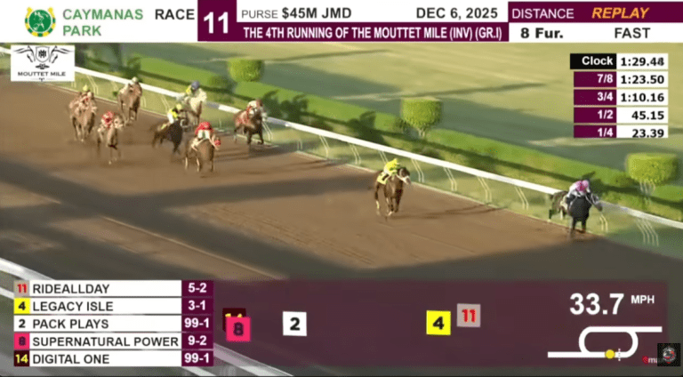 US Hall of Fame jockey Javier Castellano made the trip to Jamaica to ride Rideallday in the Mouttet Mile at Caymanas Park on Saturday and it proved to be a very worthwhile journey as his mount ran out a 9 length winner. Sent off at odds of 5/2, this was a relatively comfortable success for Rideallday, who sat 3 lengths behind the pace down the back straight before being asked for his challenge in the home stretch. This was a performance built around the power of the horse, who recorded an average stride length of 25.54 ft as he galloped on relentlessly in the straight at Caymanas Park. For some comparison, the next 3 horses to cross the line recorded average stride length figures of 24.12, 24.48 and 23.31 ft. With such a long stride compared to his rivals and the skill of Castellano to get his mount into the right position around the far turn, the pair were always likely to have a winning chance if they got a clear run for the line and so it proved.