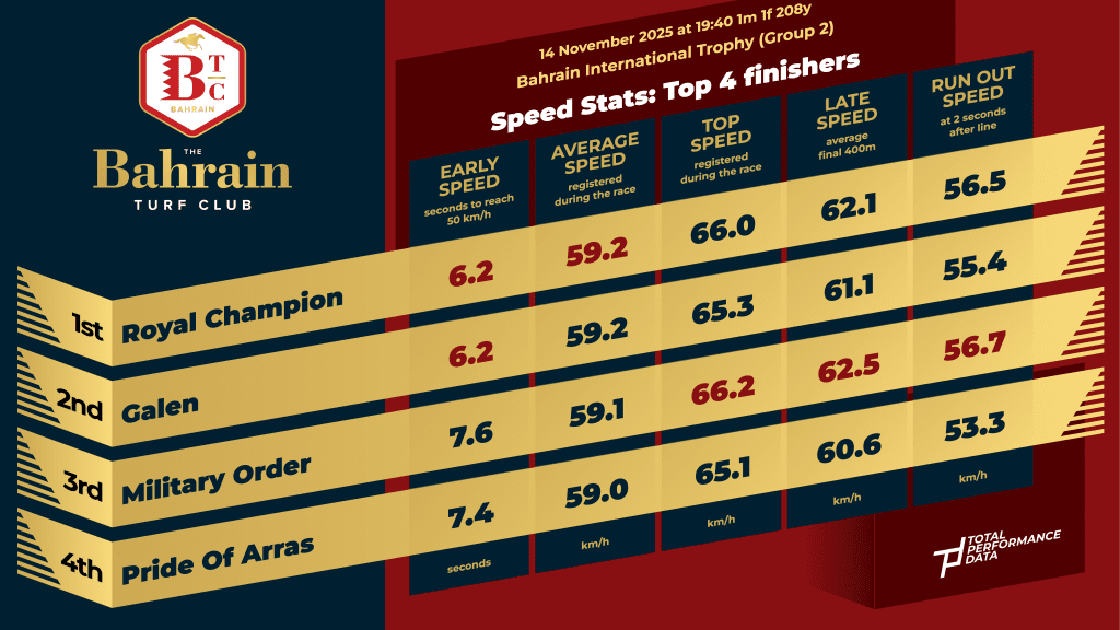 Early in the Bahrain Turf Club season, Royal Champion won the illustrious Bahrain International Trophy for trainer Karl Burke. The winner would go on to win the Neom Turf Cup in Riyadh in February but the form in behind has worked out nicely too with both Calif and Bright Picture winning in pattern company since. In a race that developed into quite a tactical affair, James Doyle gave Royal Champion a superb ride as he sat and waited for the right time to accelerate, delivering his mount perfectly despite the fact that he failed to run the fastest individual furlong split at any point of the contest. Royal Champion clocked a top speed of 40.99 mph in the Bahrain straight, considerably quicker than the runner-up (Galen) as he ran on to win by three-quarters of a length. In a race where all 8 runners recorded a finishing speed above 105%, this was one the best judgements of pace that we saw anywhere in the Middle East over the winter.