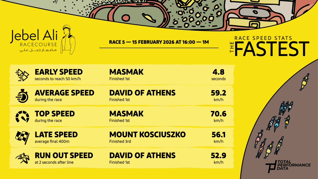 Arguably, the most thrilling finish of the entire season in the Middle East took place at Jebel Ali, as David of Athens and Masmak could not be separated as they dead-heated for the win in the G3 Jebel Ali Mile, the feature race of the season at the course. The pair were involved in a “heads up, heads down” battle over the final furlong, with both of them putting their heads down on the line, whilst Mount Kosciuszko less than a quarter of a length behind in 3rd place. The winning pair could not be separated on the clock and there was very little between the pair in the data either. David of Athens was the faster finisher of the pair, recording a late speed figure of 55.82 km/h, but that was just 0.2 km/h quicker than Masmak, who had recorded the faster overall top speed figure at 70.56 km/h. Their epic battle began with around 3 furlongs to run and given that our sectional timing data shows that there was just 0.15 between them over those closing splits, both sets of connections are likely to feel both relieved and slightly unlucky to have tied for the top prize.