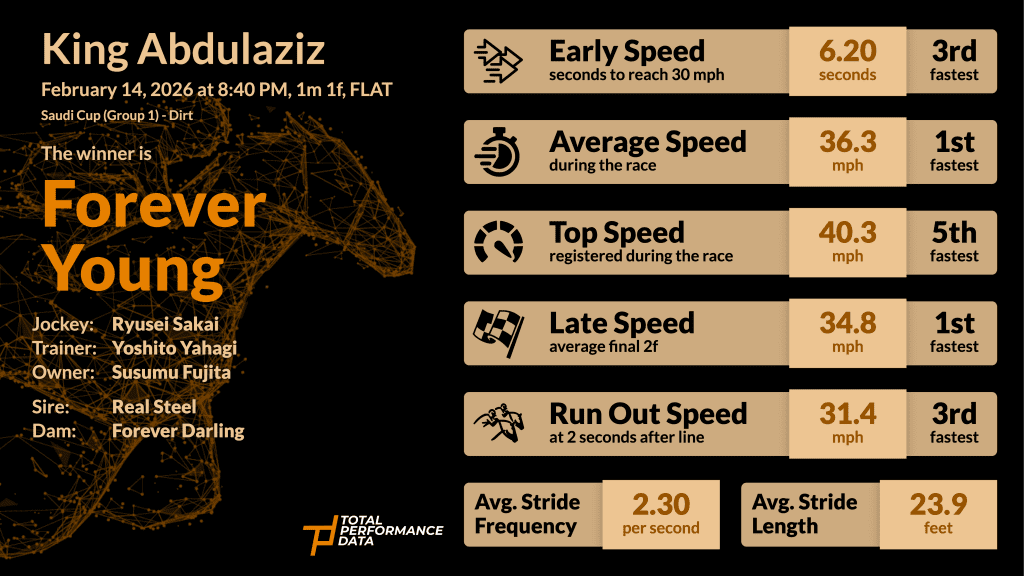 February also saw us heading to the King Abdulaziz racecourse in Riyadh for the Saudi Cup. Who can forget the fabulous race that the Saudi Cup served up between Forever Young and Romantic Warrior in 2025 and the reigning champion didn’t disappoint his fans 12-months later. Forever Young was able to add another Saudi Cup to his already impressive CV over the winter. Yes, he was beaten in the Dubai World Cup for a second year in a row, but I think time will tell that he was beaten by a top class performer in Magnitude and the fact that no horse has completed the Saudi Cup – Dubai World Cup double yet is probably testament to how significant his task has been in the last 2 years. In the Saudi Cup, he ran the fastest final 3 furlong splits and recorded a race best late speed figure of 34.8 mph. Although I must admit that he did get the ideal run round the track in Riyadh, the fact that the runner-up recorded a longer average stride length and higher top speed should not be underestimated. Nysos is a Breeders’ Cup Mile winner after all and probably ran close to a career best to get within a length of Forever Young in his optimal conditions. Bob Baffert’s charge has won 7 of his 9 races and has only been defeated by G1 winners in his career (Forever Young, Mindframe). All roads would appear to lead towards a shot at the Breeders’ Cup Classic at the end of October, where he will probably take on Forever Young once again. Around the tighter turns and shorter straights of Keeneland, the Baffert team will surely be hoping that he can narrow the gap and they should take plenty of encouragement from the Saudi Cup form. If they were to meet at the Breeders’ Cup, presumably with the best of the 3-year-old crop added to the mix, then the Breeders’ Cup Classic is likely to develop into one of the best races of the season.