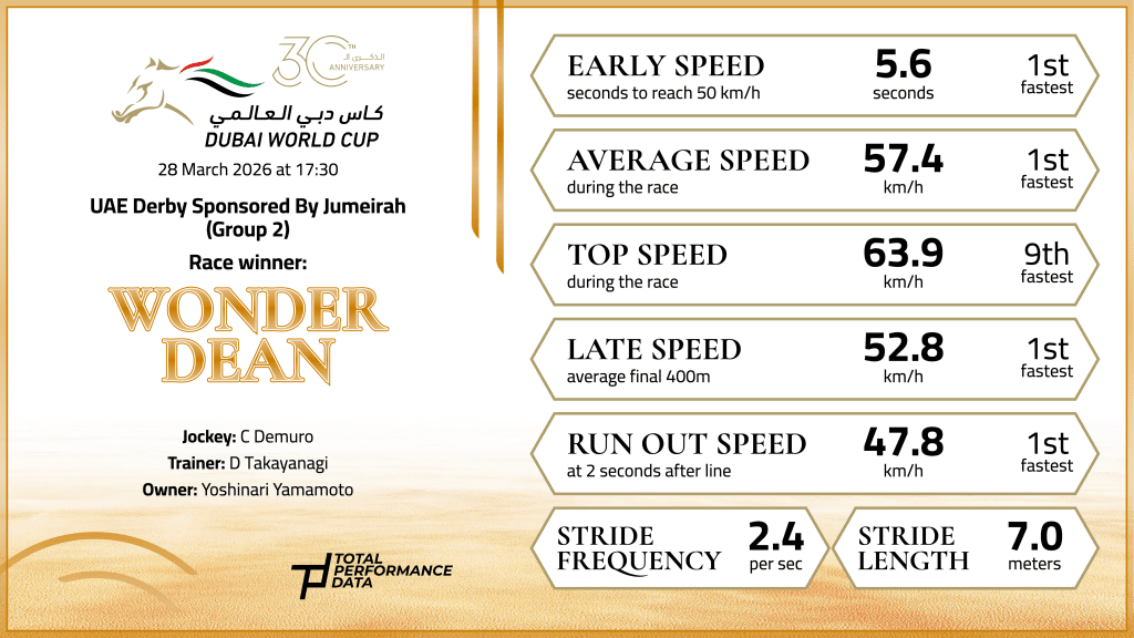 Finally we come to Dubai World Cup Night at Meydan. I want to start with Wonder Dean, who delivered yet another success in the UAE Derby on World Cup Night for Japan and he is the other 3-year-old horse to take from the winter season. This was the 5th year in a row that a Japanese trained horse has won this race and a 2nd successive victory for trainer Daisuke Takayanagi. The son of Dee Majesty had only been 4th in the Saudi Derby but he took his form to an entirely different level when winning the UAE Derby. With an average stride length figure of 7.03m he isn’t the biggest type by any means, but what he lacks in size he makes up for with a beautiful blend of speed and stamina. At a peak average of 2.65 strides per second, he had the highest stride frequency figure in the field and that translated to an impressive top speed figure of 63.9 km/h as he ran out a two and a quarter length winner. Having earned 100 points on the road to the Kentucky Derby, it will be interesting to see if he lines up at Churchill Downs in a few weeks time and whether he can do better than his compatriot Forever Young, who finished 3rd in the Kentucky Derby in 2024 after winning this race.