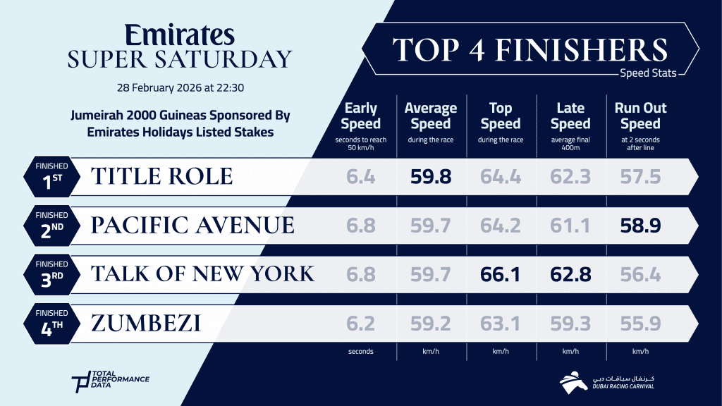 I didn’t want this piece to simply be a repeat of the earlier pieces that I have written on this blog when covering the racing in the Middle East so I am going to add a horse to follow. That horse is the Charlie Appleby trained Talk of New York who ran in the Jumeirah 2,000 Guineas on Super Saturday. He had been so impressive when making a winning debut at Kempton Park in October that he was expected to be hard to beat when he lined up in the Jumeirah 2,000 Guineas at Meydan in February. He ultimately finished 3rd and that form has yet to really be tested, but whilst I was disappointed at the time, having watched it back a few weeks after the event, I am convinced that he was the best horse in the race and that he should make up into a leading player in the 3-year-old division in Europe this year. The Godolphin team employed Pacifica Pier as a pacemaker and he set decent fractions in front, reaching the halfway point in 49.05s. Despite this pace, William Buick didn’t look entirely comfortable aboard Talk of New York, despite racing towards the rear. Coming wide into the straight, he made up a lot of ground and closed with a top speed of 41.09 mph, the fastest top speed figure in the field (next best 40.03 mph). He recorded a time of 10.95s for the penultimate furlong, the only time that any of the runners in the 9 runner field dipped below the 11s mark and at a peak average of 25.25 ft, his stride was significantly longer than the 2 horses that finished ahead of him. Taking all of that into account, I think he did incredibly well to get so close to the winner (Title Role) and in time, I think he will prove to be the best horse in this year’s Jumeirah 2,000 Guineas. A return to the UK and a more galloping track are sure to help him to prove that.