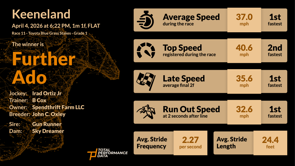 A winning time of 1:49.58 made this the fastest winning time in the Blue Grass Stakes since Essential Quality in 2021 and Further Ado was 1.75s faster than the 2025 winner Burnham Square. Further Ado recorded a finishing speed of 97.6% and was helped to his fast time figure by a strong early pace with several of his rivals battling for the lead. The leaders covered the opening 5 furlongs in under a minute and having sat directly behind that pace, Irad Ortiz Jr. had Further Ado ideally placed, but as the leaders began to tire around the turn, Further Ado moved front and centre and began to power clear of the field. He closed with furlong splits of 12.35, 12.27 and 12.79s, each of which was the fastest split in the field as his stride frequency increased to an average of 2.31 per second in the penultimate furlong. That figure made him the only horse to record a stride frequency figure above his race average (2.27 per second) in the latter half of the race and helps to explain his dominant display in the latter stages. As might be expected, his late speed figure of 35.63 mph was a clear best (next best Ottinho 32.02 mph) and Further Ado was a class apart in this field.