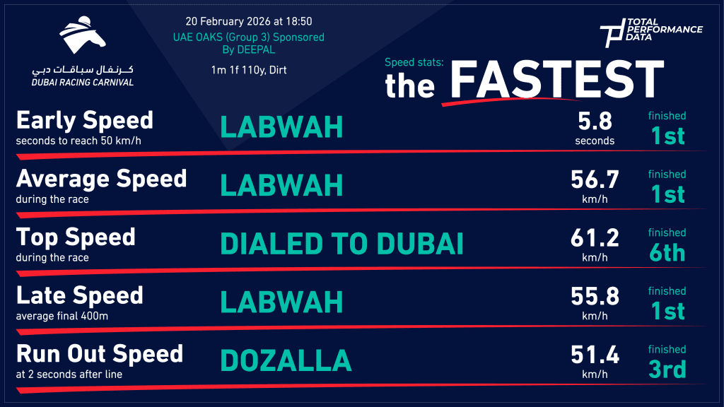 A low draw in stall 1 definitely helped her cause, but Labwah still needed to show bright early speed to hold the rail and she certainly did that, reaching 50 km/h in just 5.8s (ranked 1st of 7) and running 21.03s to reach the mile pole. From there, Bernardo Pinheiro was able to dictate the pace despite the fact that at an average of just 6.92m, Labwah had a much shorter stride length figure than both Yuno (2nd) and Dozalla (3rd). Whilst it is important to note that she has taken the shortest route and covered around 4m less than the runner-up, she was simply too fast and none of her rivals had the necessary speed to challenge her for the lead. With 3 furlongs to run, Bernardo Pinheiro asked Labwah to go and win her race and she responded readily to run closing splits of 12.70, 12.34 and 13.34s, each of which was the fastest in the field. With the exception of the opening furlong, her average stride frequency reached its race peak of 2.37 per second in the penultimate furlong and having galloped through the line with a run-out speed of 48.5 km/h. There’s an advantage to be had by racing in front and out of the kickback, but at no point in the race did she look like being headed and against the fillies, she would appear to be close to unbeatable around the dirt course at Meydan after a fairly flawless performance in the UAE Oaks.