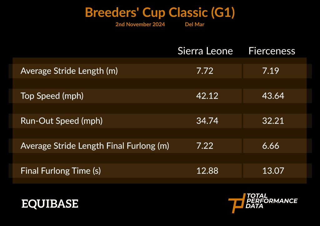 The data shown above is a direct comparison between Sierra Leone and Fierceness from the Breeders’ Cup Classic in 2024. Once again the top speed figure can be slightly misleading given that Sierra Leone ranked 9th for that metric, but in a better race, I would argue that the data suggests that the winner produced the best performance of his career, especially in the latter stages of the contest. The data above is comparing him to Fierceness, a horse who came into the 2024 Breeders’ Cup Classic having already won a Florida Derby and a Travers Stakes during his 3-year-old campaign. At the time, he was arguably the best horse that Sierra Leone had faced and yet the difference between the pair in the home straight at Del Mar is stark. The sweeping move made by Flavien Prat around the home turn was a sight to behold and once in front, he had the better of Fierceness, with the subsequent Saudi Cup winner Forever Young a further length and a quarter back in 3rd. It’s easy to forget just how strong that form is and having been brought back as a 4-year-old, presumably with this race as the main target for the entire campaign, if he peaks again in November, he is the horse that sets the standard. The “Elephant in the room” is Sovereignty. He is probably the best 3-year-old to have run in the US in the last 5 years and having beaten everything that his own generation has thrown at him, it is likely to take a monumental effort for Sierra Leone to give weight away to him in the Classic. However, last year’s race, which had a race finishing speed of 95.8% and a winning time that was over 2s faster than White Abarrio the year before, brought out the best in Sierra Leone. He will need to produce another career best to beat Sovereignty, but the data suggests that an opponent of that quality may help him to do so.
