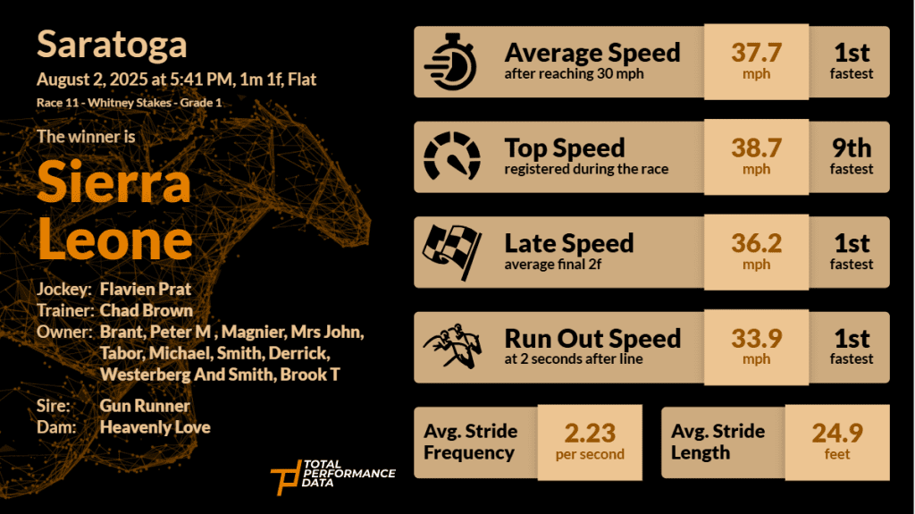 An initial look at the data above would suggest that he ground out this victory. A top speed of 38.7 mph ranked him last of the 9 runners and if taken in isolation, that statistic might suggest that he was able to pick up the pieces when the pace collapsed in the latter stages. He certainly finished the race strongly, running the fastest final 2 furlongs (12.10, 12.45s) and recording the best run-out speed in the field at 33.93 mph. However, a race finishing speed of 98.5% would suggest otherwise and the fact that there were 4 other horses who recorded a run-out speed within 1 mph of Sierra Leone’s would suggest that this wasn’t a case of “survival of the fittest”. On his last 3 starts, the races have had finishing speeds of 99.4%, 98.5% and 99.1% and I would argue that Sierra Leone, who recorded the longest average stride length in the field in the Whitney Stakes at 25.10 ft, is better suited by a race run with a faster early gallop. If we make the assumption that he has been running well in races where the pace has not suited his style, then ought we also be able to assume that in a better race, with better horses and a faster gallop, he will improve again? I thought it was significant that in the home stretch of the Whitney Stakes, Flavien Prat used the persuader just 3 of 4 times and just once in the final furlong. Once his mount was in full stride, there was no need to ask for anything more as Sierra Leone came past Highland Falls with relative ease. Now clearly Highland Falls is unlikely to win the Breeders’ Cup Classic and there are certainly tougher opponents ahead, but if he won the Whitney Stakes with something in hand, then there are plenty of reasons for optimism when he returns to Del Mar in November.