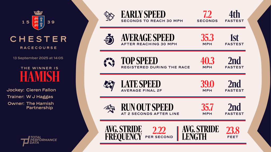 Several of the horses in this piece may not race next season, but that doesn’t mean that we can’t celebrate some of the Legends of the Sport and that accolade certainly applies to Hamish. He was winning for the 14th time for William Haggas when he landed the Listed Virgin Bet Stand Cup Stakes in mid-September. Tracking the leaders under Cieren Fallon, he forced his way between runners around the final turn and once hitting the front at the top of the home straight, there was only ever going to be one winner. He was the fastest horse in both the 10th and 11th furlongs as he hit the front and whilst the fast-finishing Mount Atlas was closing on him at the line, Hamish had the race won by that point after recording a top speed of 40.31 mph. This was a 3rd win on the Roodee for Hamish after success in the Ormonde Stakes at the May Festival in 2022 and 2023 and if he is back next year, it wouldn’t be impossible to think that he could add another Chester success to his CV if he gets the soft ground that he needs.