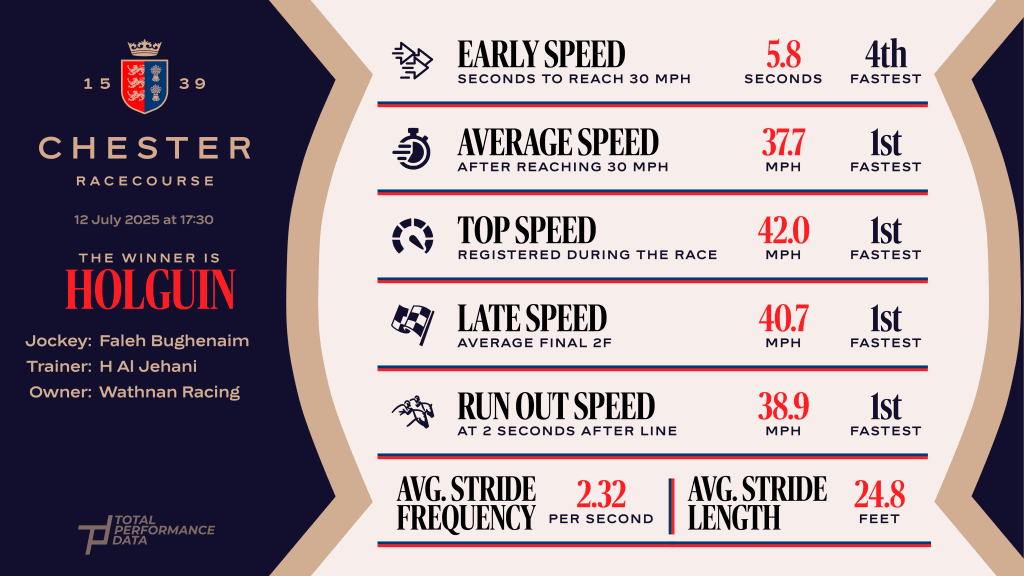 The Wathnan racing colours were in the winners enclosure in July as Holguin landed the City Plate Stakes under Faleh Bughenaim. We haven’t seen the winner since, but the form has worked out exceptionally well with both the placed horses, Witness Stand and Marvelman, subsequently going on to win in Group company. Holguin was a clear best in this race as you can see from the data set above and it is particularly noticeable that his top speed figure of 41.96 mph was 0.78 mph faster than anything else in the field. Settled behind the pace from his high draw, he quickened readily in the home straight as he ran the fastest final quarter of a mile in just 22.23s to win by a head. The strength of this form is there for all to see after the superb efforts of the placed horses in the interim period and it will be fascinating to see what Holguin can achieve the next time that he takes to the track.