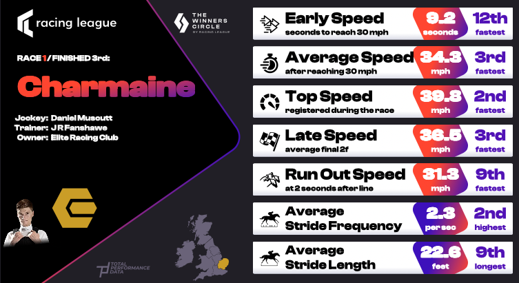In the 1 mile 3 furlong handicap at 8:15 we have one of the stars of the season in Crowd Quake. He has already won 7 times this season for Stuart Williams, including a victory at Chepstow for the East team earlier in the Racing League. Despite being drawn wide in stall 12, he isn’t easily opposed but there is some hope from the data that the other runner for the East team, Charmaine, might be a better value play. We haven’t seen her since she finished 3rd on the opening night at Yarmouth, but that form behind Fantasy World has worked out reasonably well and having been switched inside on a night where the prominent racers had a clear advantage, that effort can be upgraded. She ran the fastest 9th furlong in the race (11.48s) when making ground in the straight and given that the winner and 2nd had much longer average stride lengths, she can be forgiven a slightly tired final furlong given the amount of ground that she had to make up. She recorded a better top speed figure than the 2 horses that finished ahead of her and given that all 3 career wins have come on the All-Weather, including a win over this course and distance in March, she makes a lot of appeal for a good draw in stall 5.